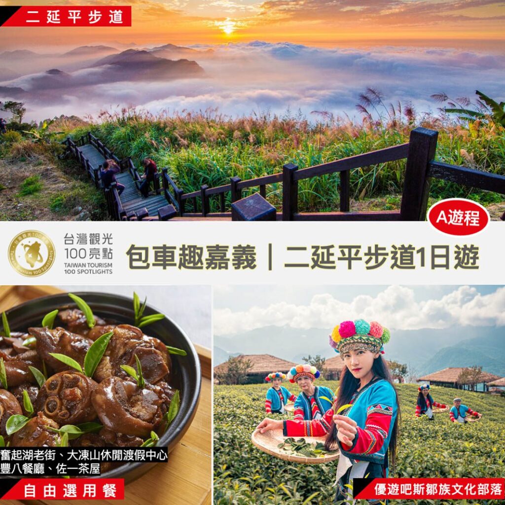 除集點活動,文觀局還提供90車次包車服務,2人或4人即可成行,最高可享有折抵2,000元的專屬優惠價,共有6款專屬遊程可以預約選擇,包含二延平步道、太平雲梯、故宮南院、逐鹿文創園區、奮起湖及其步道群等遊程。6月1日中午12時開放線上預約(登記連結:豐八國際租賃有限公司粉絲專頁 https://reurl.cc/zqkVda ),額滿為止。包車優惠活動資訊可洽詢陳小姐(0923-729-310)或吳先生(0985-996-890)