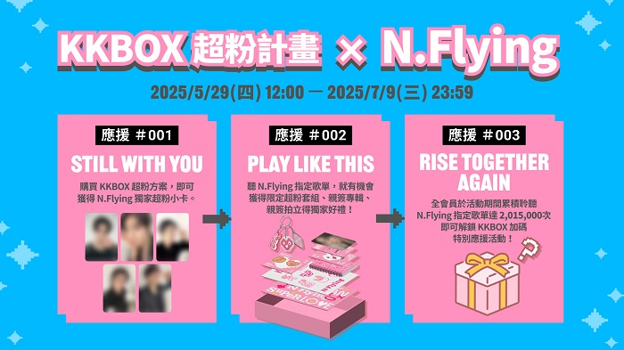 自去年推出的「超粉計畫」以來,KKBOX透過獨特的聆聽任務和實體活動,加強粉絲與藝人之間的互動,並獲得大量好評。此次與N.Flying的合作,將帶給粉絲們不僅是收聽音樂的體驗,還可藉由參與活動支持偶像並收集限量收藏卡。科科科技亞太事業區暨 KKBOX 總經理葉展昀表示,此次合作是象徵KKBOX在亞洲音樂市場中的領先與突破,期待透過創新的應援形式增強粉絲參與感,同時為藝人與粉絲之間創造更具價值的連結。