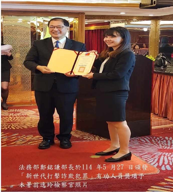 台南地檢署翁逸玲檢察官於近日指揮專案小組查獲許姓被告等人共組之跨轄區詐欺集團,打擊詐欺犯罪不遺餘力,且成果亮眼;翁檢察官於27日在台北市天成飯店舉辦之頒獎典禮中,由法務部長鄭銘謙親自頒發獎座,展現法務部及高等檢察署對台南地檢署辦案績效與打擊詐欺之高度肯定。下圖說明:檢察官翁逸玲偵辦詐欺集團獲「新世代打擊詐欺犯罪」獎項,由法務部長鄭銘謙親自頒發獎座。(圖/南檢提供)