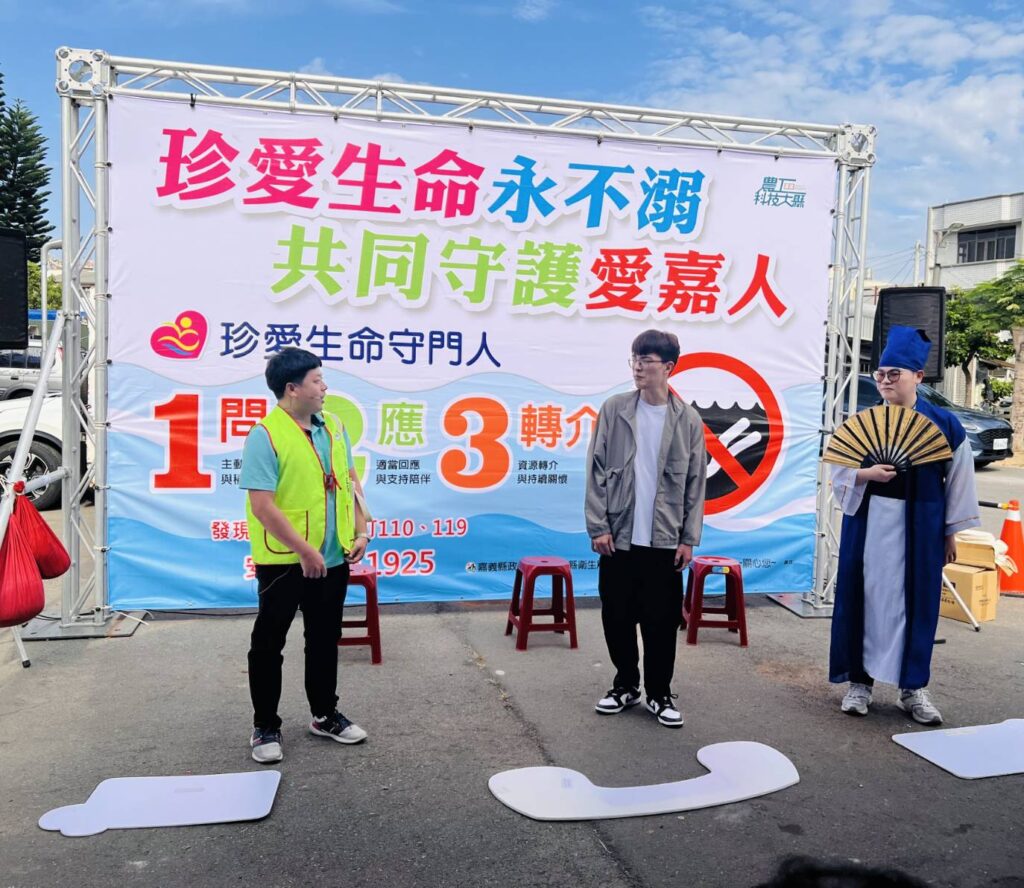 嘉義縣衛生局26日在布袋中安里3+1行動醫療現場,舉辦「珍愛生命永不溺 共同守護愛嘉人」,由社區心理衛生中心同仁穿越歷史、發揮創意以詼諧現代劇演出「別讓屈原笑我傻」,藉由幽默劇情呼籲大家發揮自殺守門人的精神,多一句問候、適時關懷,降低生命遺憾發生。