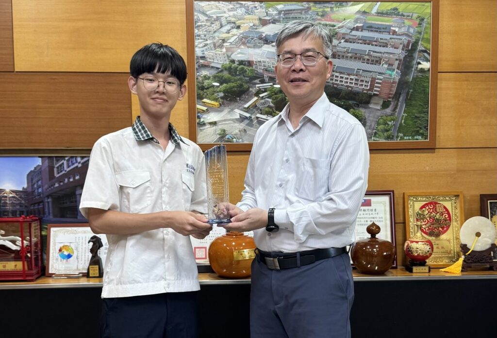 ▲校長與散文類第1名洪紹博同學合影。(圖/溪湖高中提供)