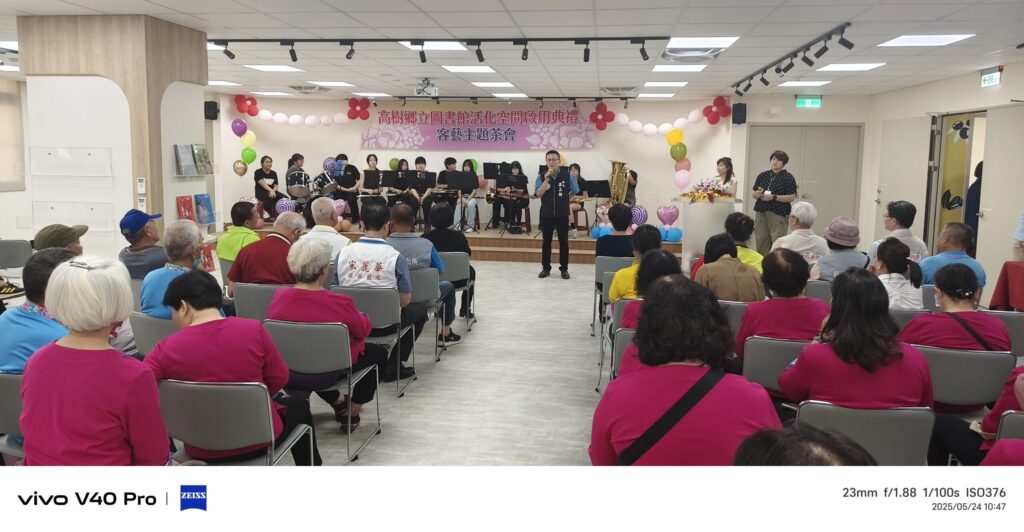 為了豐富高樹地區地藝文品質,高樹圖書館也推出「溫馨五月-看電影學母語」活動,於活動日下午播放文創動畫《諸葛四郎大戰魔鬼黨》華語場,並於現場發放爆米花,增添觀影樂趣。另在三樓展演室現場特別安排了高樹國中管樂隊、打嘴鼓及客家山歌等在地團體演出,展現高樹鄉豐富多元的客家藝文風采。高樹鄉立圖書館全新空間不僅提升教育資源與學習環境,也打造了友善的無障礙環境、親子友善空間,成為地方文化創生與交流的重要據點。