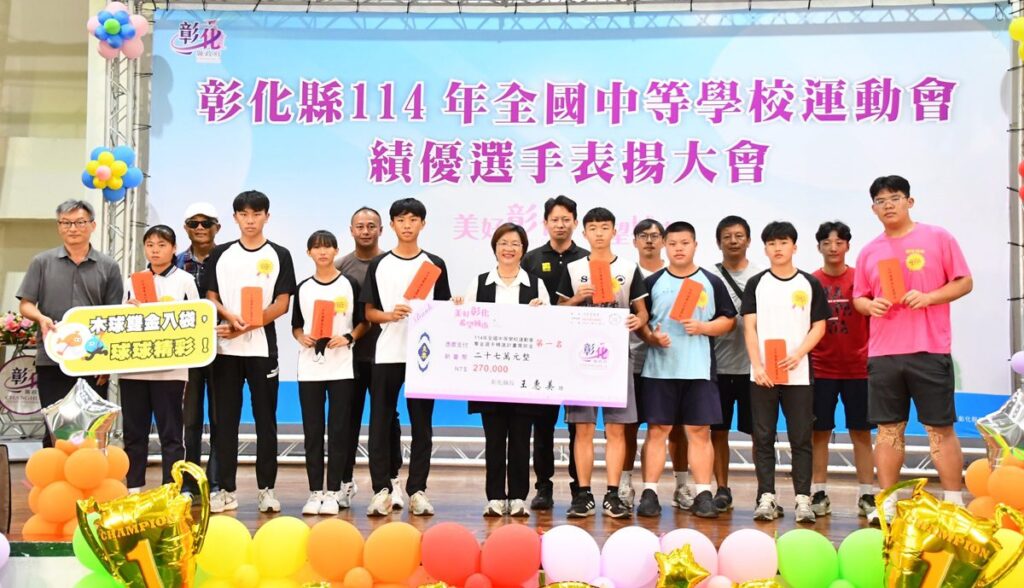 彰化縣代表隊參加在臺南市舉辦的「114年全國中等學校運動會」,表現亮眼,榮獲18金、18銀、33銅,共計69面獎牌,充分展現選手堅強的競技實力與長期累積的訓練成果。為肯定選手與教練的努力,縣政府今(22)日上午於彰泰國中展藝館舉行表揚大會,由縣長王惠美親自表揚。王縣長表示,感謝所有得獎的選手、教練、師長與家長會長們的用心與努力,在大家用心努力之下,在114年全中運寫下輝煌的歷史,總計奪得18金、18銀、33銅,共計69面獎牌,除了獎牌數之外,背後是大家用心努力的成果,這次全中運縣府發放總計超過800萬元獎金,以厚植優秀運動人才的三級培訓,期盼選手們能無後顧之憂的訓練,持續為縣、為國爭光,期勉選手們持續突破自我、再創佳績、為縣爭光。