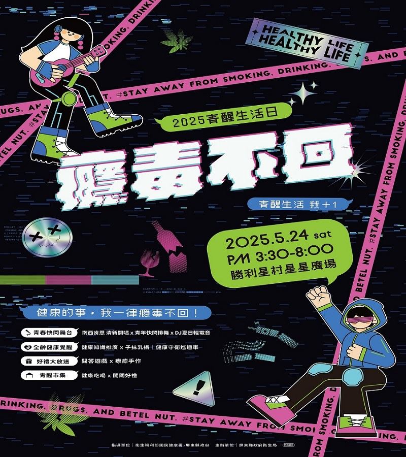 【記者蔡保泰/屏東報導】 屏東最青春的健康宣言,今年夏天在勝利星村熱烈引爆!屏東縣政府衛生局為響應531世界無菸日,舉辦「2025青醒生活日」,將於5月24日(六)下午3點半在勝利星村星星廣場以「青春宣言:健康的事,我一律癮毒不回!」為號召,邀請全縣青少年透過音樂、舞蹈、遊戲與創意表達對健康生活的支持,勇敢拒絕菸、酒、檳榔、毒品與網癮。
