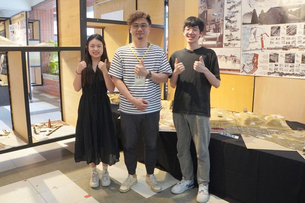▲大葉大學空設系紀彥竹老師(中)恭喜石兆永(右)、王玟今(左)入圍A+。(圖/大葉提供)