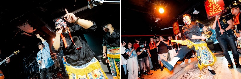 緊接著震樂堂以特別改編版的〈光明燈〉揭開主場序幕,現場瞬間轉為肅穆莊嚴。台式饒舌結合西方重型搖滾的張力演出,一連五首帶著傳統科儀的作品震撼登場。樂手身穿龍虎裙、臉繪官將首臉譜,如神將降臨,以全感官的編制打造沉浸式音樂現場。觀眾彷彿置身廟會神轎出巡、鼓聲震天的隊伍之中,踏入文化與信仰交織的民俗盛會。