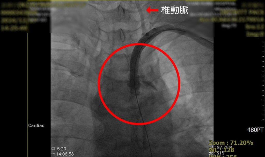 賴主任說,馬上推測患者本身動脈存在嚴重狹窄,導致洗腎的血流偏低,當下安排血管攝影,看到患者鎖骨下動脈開口處幾乎完全阻塞,這種情況稱為「鎖骨下動脈竊血症候群」。