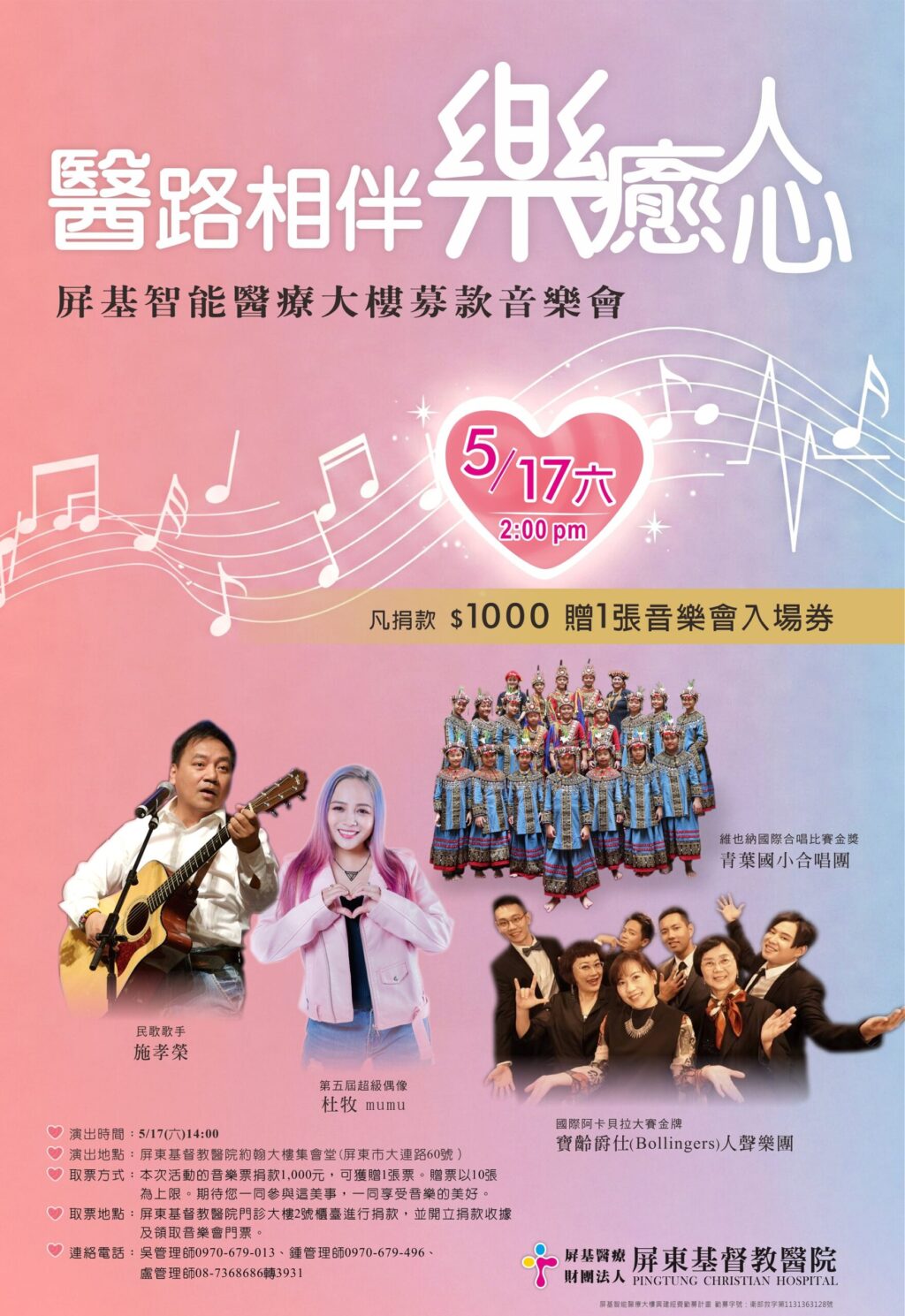 【記者戴英薇/屏東報導】 為感謝捐款人支持智能醫療大樓興建計畫,屏東基督教醫院「醫路相伴樂癒人心」募款音樂會,將於17日下午2點在屏基約翰大樓六樓溫馨登場。屏基貼心地為捐款人預備停車場,位置就在瑞光路三段優生產後護理之家旁空地,並提供接駁服務。
