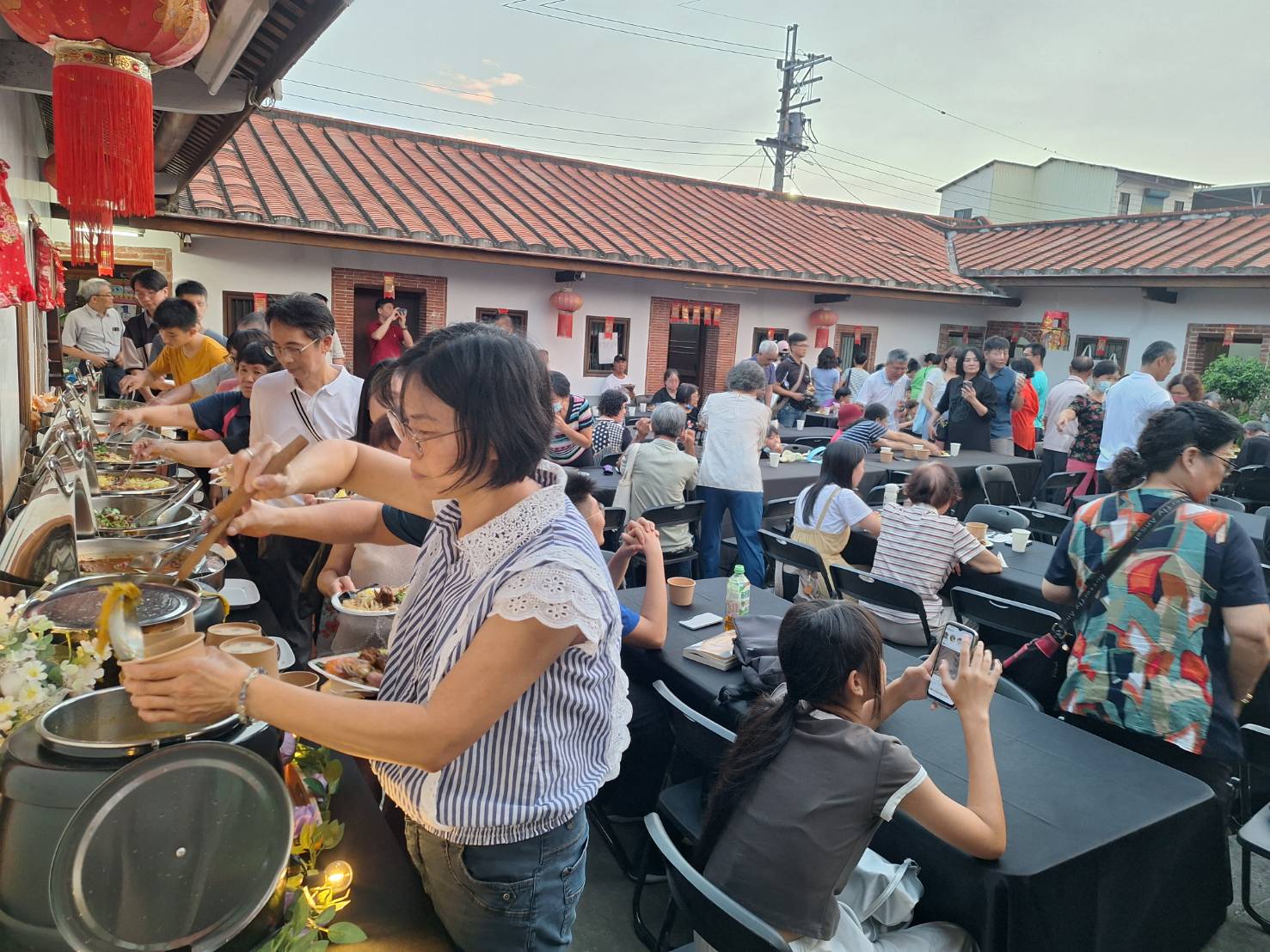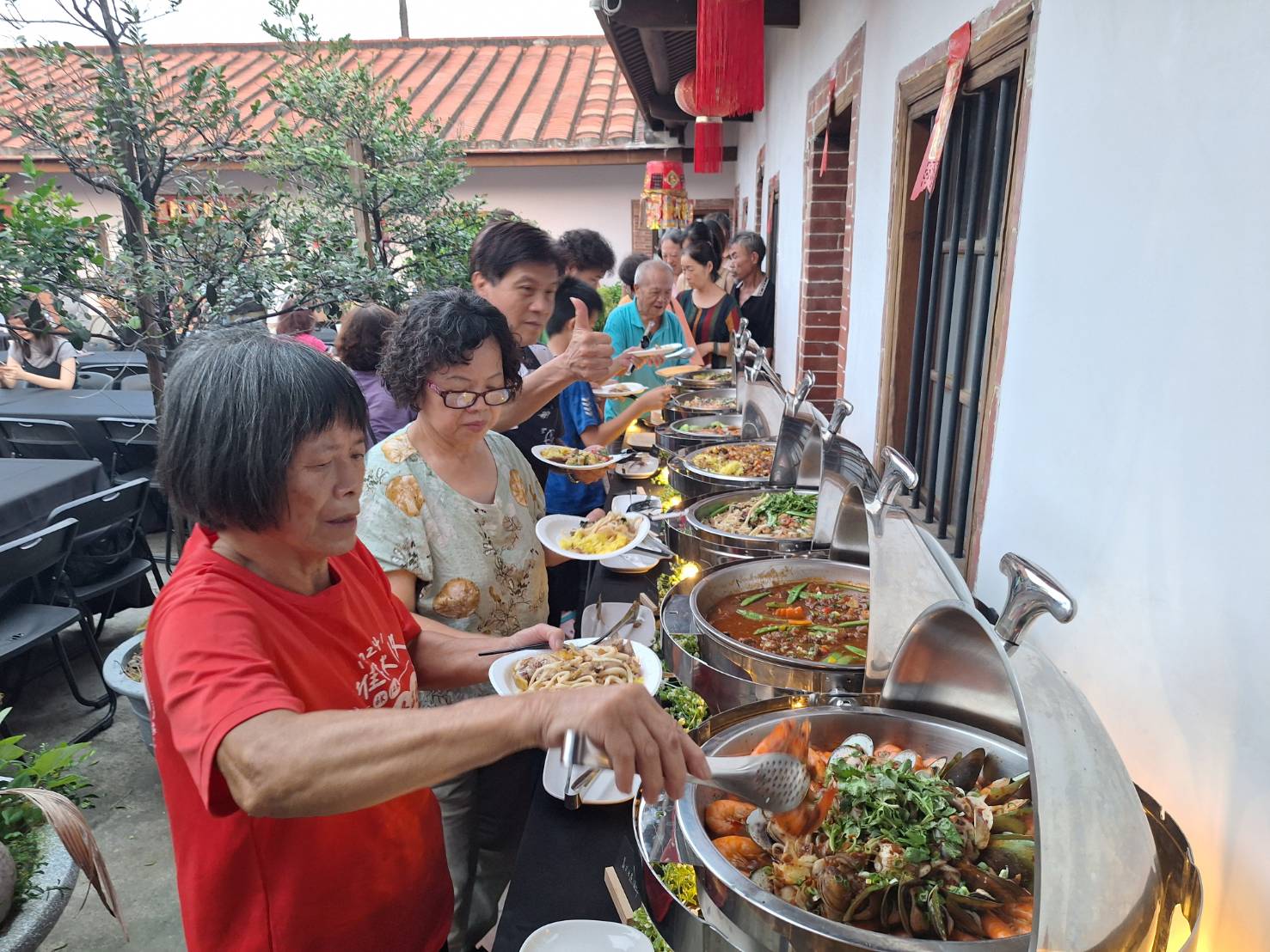 現場席開多桌,熱情鄉親踴躍出席,場面熱鬧非凡。由鍾家和興伙房精心布置的庭院燈火通明、氣氛溫馨;活動備有豐盛的自助餐點,佳餚美饌琳瑯滿目,從熱菜、湯品到各式新鮮水果與甜點一應俱全。鄉親們在長桌前排隊取餐、閒話家常,孩子穿梭其間嬉戲,長輩們舉杯話團圓,笑聲與音樂聲交織成一幅最動人的中秋畫面。