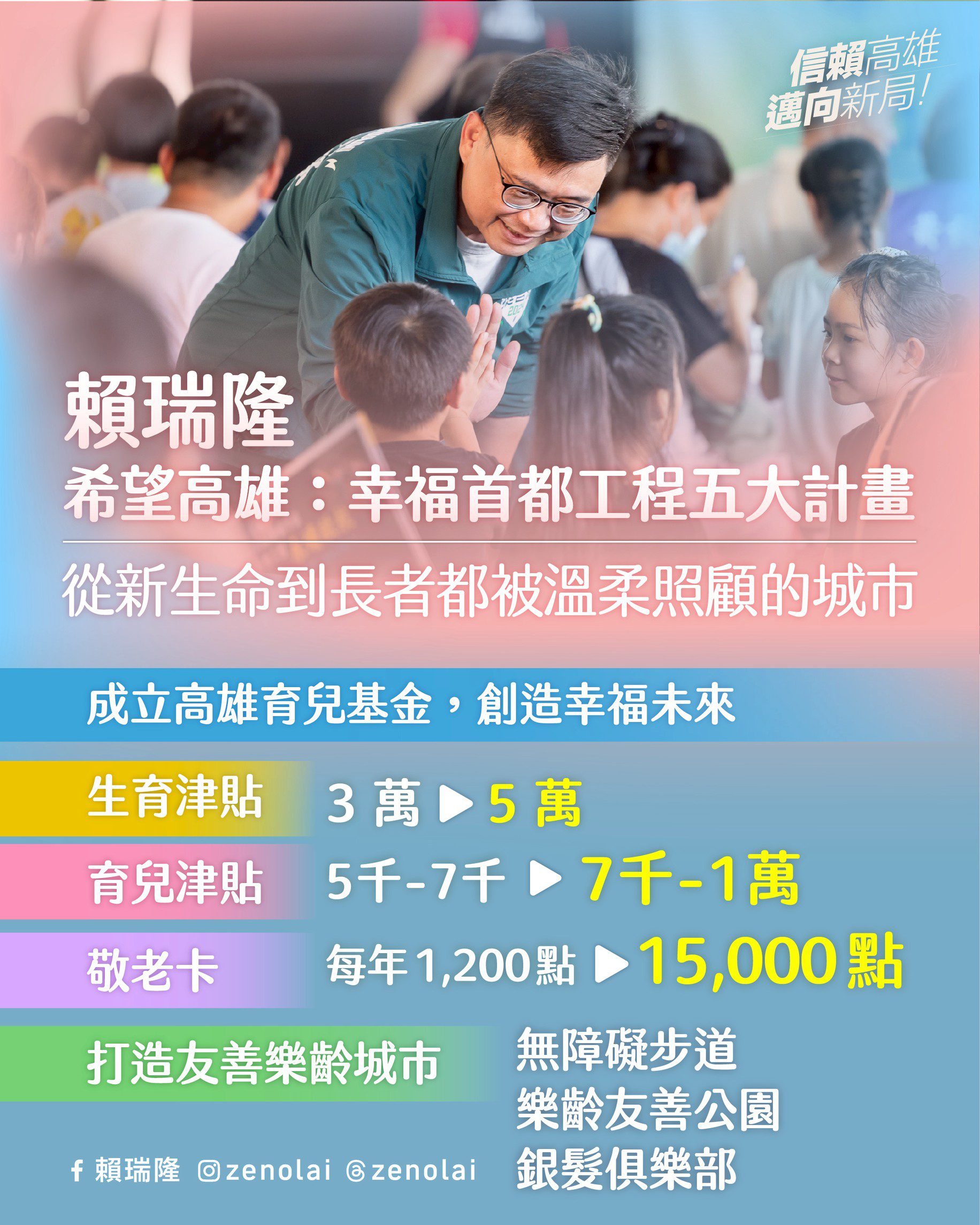 賴瑞隆說明,如今高雄面對少子化與超高齡社會雙重挑戰,城市競爭力不只在產業,更在「人」。未來,因應國際企業進駐可能帶來的新興人口趨勢,須超前部署做好準備,他除了將延續硬體及產業發展,更要讓高雄成為一個從出生、成長到老年,都能安心生活的「幸福首都」。