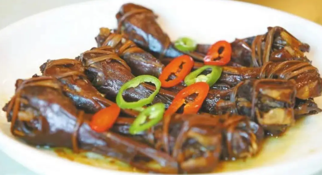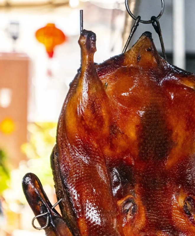 斗門乾務虎山村金巢琵琶鴨,運用傳統燒制方法,出品色澤均勻,口感甜而不膩,脆中爽滑。原料就地取材於田間地頭,其製作技藝成為珠海非物質文化遺產。它外脆裏嫩,口味甜中有鹹,層次分明,肥而不膩還隱約有果木香氣。蘸上酸甜的梅果醬更多了份爽脆的口感。據說,這裏用的醬料都是師傅特調,別地無處可尋。