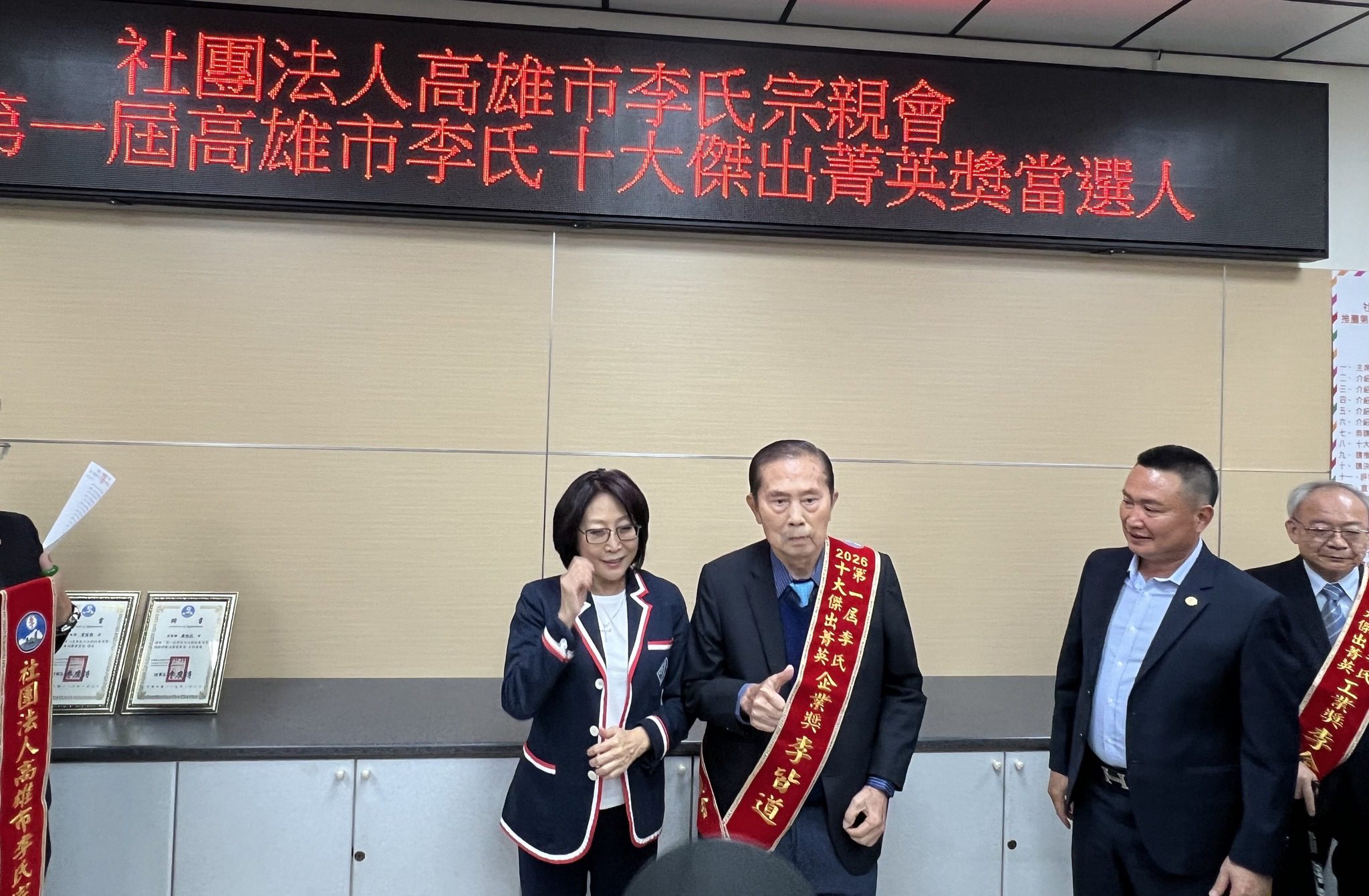【記者林意雯/高雄報導】社團法人高雄市李氏宗親會於 2026 年於115年1月6日下午14點於高雄市議會,隆重舉辦首屆「十大傑出菁英獎」選拔活動表彰各行各業中表現卓越、對社會具深遠影響力的李氏宗親。經嚴謹評選,共遴選出十位來自不同領域的傑出代表,展現李氏宗親群英薈萃、世代傳承的精神風範。其中,順吉位、順升昌企業股份有限公司董事長 李皆道先生憑藉數十年如一日的實幹精神與回饋社會的行動力,脫穎而出,獲頒企業獎此項殊榮,現場宗親齊聚,共同見證這份榮耀。