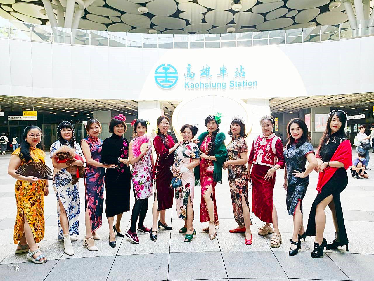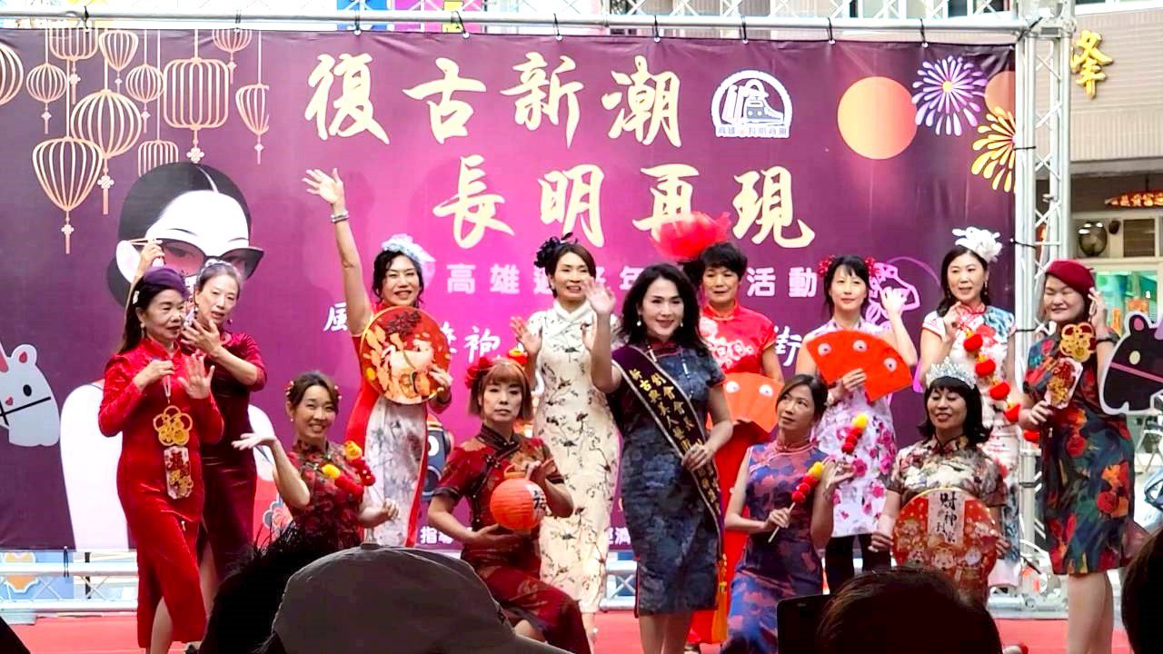 長明商圈旗袍美人踩街由新古典美人藝術旗袍聯誼會、緣715、高雄揪出遊、94旗袍、花旗仙子、主題群等團隊溫暖登場!