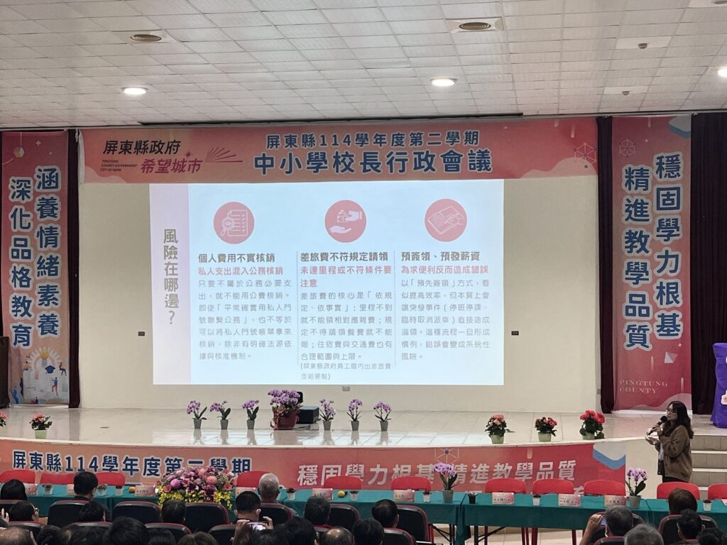 「誠師領航 屏學發光」專案以「教師專業倫理」為核心,期望從校長出發,逐步擴展至行政團隊、全體教師及未來教育人才,系統性建構校園誠信文化。首場活動特別規劃專題宣導課程,聚焦教育現場常見之廉政風險與法治責任,內容涵蓋違失案例分析、《貪污治罪條例》、《公務員廉政倫理規範》及《利益衝突迴避法》等重要法規,協助校長從治理角度理解風險辨識與決策責任,強化校務運作的透明與專業。