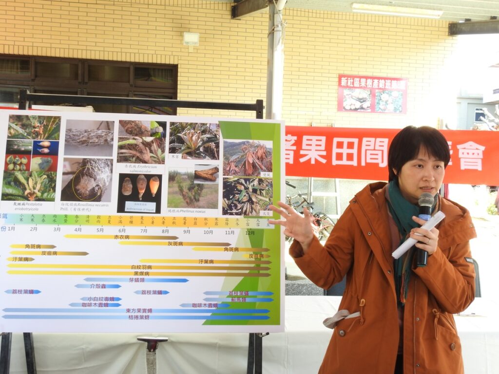為減緩天氣影響,該場與農糧署自113年起輔導臺中市新社區果園設置金屬管路微霧系統,當氣溫高於30℃即自動啟動噴霧,降低園區溫度並提高相對濕度,使枇杷開花期順利授粉著果,較未處理果園提升約10%著果率,有效減輕酥花發生。微霧降溫系統每0.1公頃設置成本約24萬元,農友亦可透過農糧署智能防災設施型農業計畫,每0.1公頃最高可申請12萬元補助,減輕建置負擔。除介紹微噴霧於著果應用外,該場並於觀摩會說明枇杷田間常見病蟲害,如灰斑病、白紋羽病、赤衣病及炭疽病等病害防治;另針對疣胸琉璃蟻防治,建議優先清除田間廢棄物,減少藏匿空間,並於操作前 1–2 週,依作物安全採收期使用推薦藥劑防治蜜露型害蟲,或以皂素、柑橘精油等資材,以降低琉璃蟻在田間操作時的襲擾。