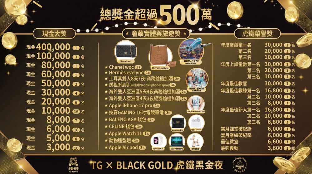 ▲虎鐵黑金夜獎項豐富,總獎金超過 500 萬元。(圖/虎鐵健身 X 器械皮拉提斯提供)