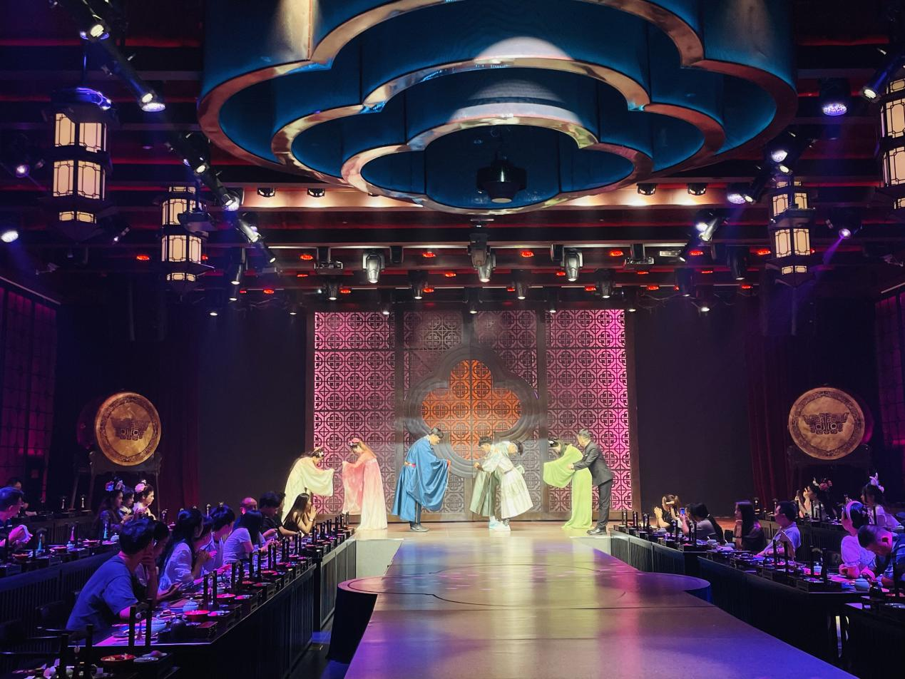 7月16日晚,在重慶市巴國城舉行的全景沉浸式文化主題餐秀活動中,悠揚的古風樂曲傳至耳畔。舞樂聲中,近40名兩岸青年沉浸式感受這場古風禮宴。