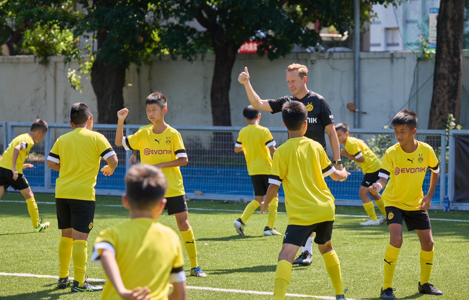 8月12日(週一)上午,被譽為世界最佳足球俱樂部之一的德甲球隊多特蒙德(Borussia Dortmund, BVB),首次在台灣所舉辦的「BVB多特蒙德足球俱樂部 菁英訓練營」於華僑高中正式展開,訓練營共為期兩周,只招募100位四個年齡段有賽事經驗的球員,由新北市板橋足球發展協會、中華民國足球協會與仁仁體育共同主辦。開營儀式當天,BVB吉祥物大黃蜂EMMA朝氣蓬勃地歡迎大家,所有參與營隊訓練的孩子與家長都提前準時抵達,都為了一睹自歐洲德國專程飛來台灣,由傳奇球星約爾格·海因里希(Jörg Heinrich)所領軍的豪華教練團陣容!此外,新北市政府體育局洪玉玲局長、台灣與德國國會議員友好協會張宏陸會長、德國在台協會首席代表暨處長Dr. EvaLangerbeck蘭依樺博士與德國在台協會副處長Mr. Andreas Hofem何峰也接連為小球員們鼓勵,共同見證這台灣足壇的歷史性時刻!
