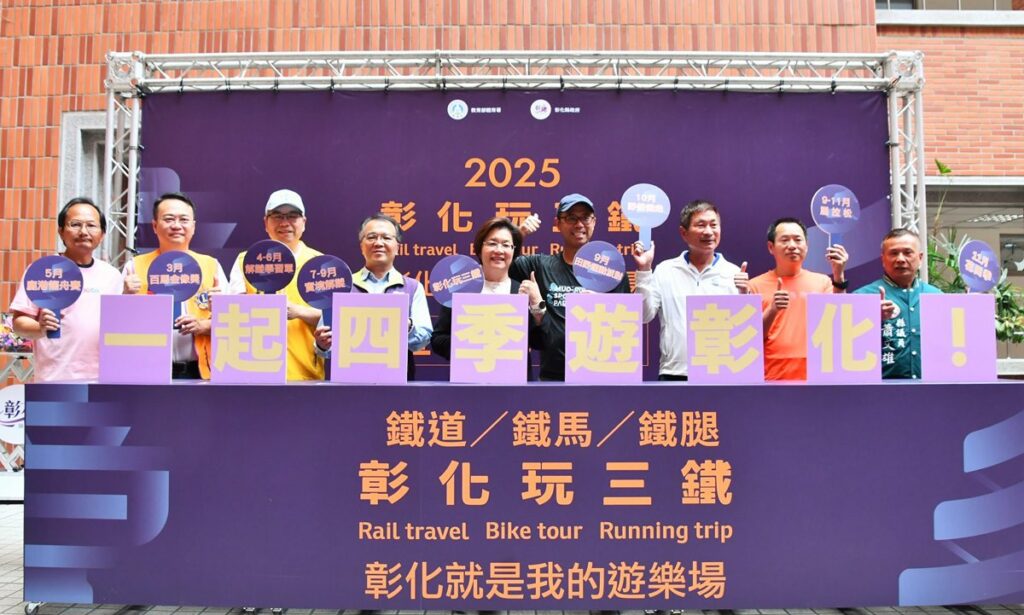 彰化縣政府近幾年致力於推動運動與觀光的結合,於今(24)日上午在警察局中庭舉辦「彰化玩三鐵宣傳記者會」,縣長王惠美表示,「彰化玩三鐵」就是民眾搭台鐵、高鐵來彰化,再以鐵馬或用雙腳的方式,遊覽彰化的風景,讓鄉親玩到鐵腿,深入體驗在地文化與自然風光,實踐「彰化就是我的遊樂場」。今年活動再升級,除了原有的「百馬金像獎」、「實境解謎」、「野餐健走」、「花田祭」外,新增了「一騎找Chill」、「北斗田野運動派對」等,從4月份春暖花開開始就有一系列的活動直到年底,歡迎大家有空來遊彰化。