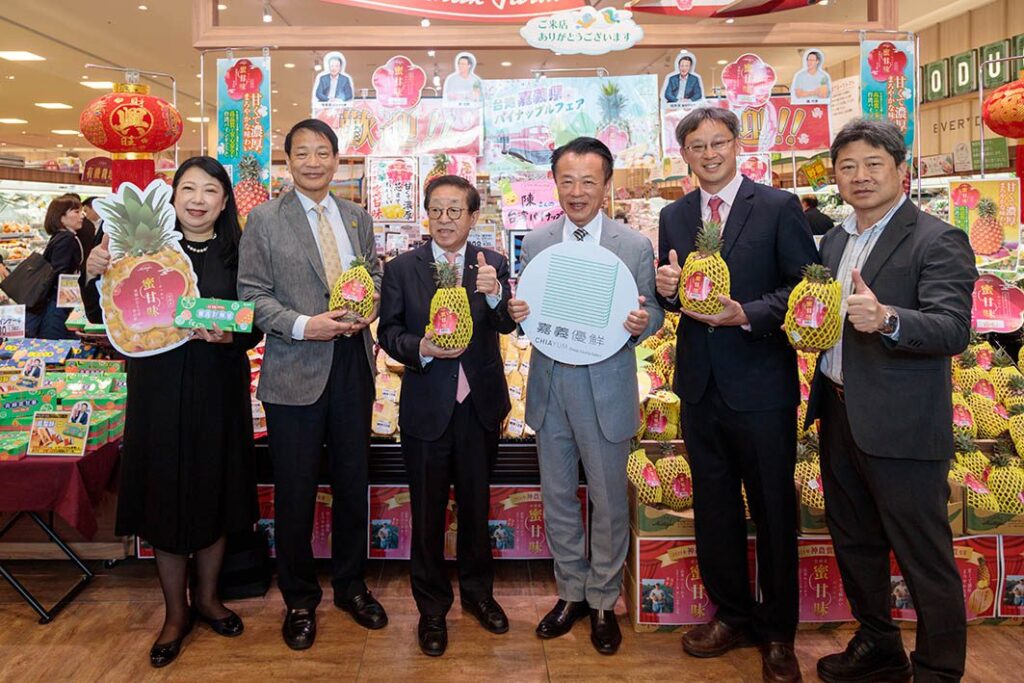 嘉義縣23日在日本山口縣丸久超市Aruk防府店舉行「嘉義優鮮-鳳梨嘉年華」揭幕儀式,除了推出往年熱銷的「蜜甘味鳳梨」,更首次上架「鳳梨酥」,日本民眾試吃後都讚不絕口。縣長翁章梁從2023年起,連續3年親赴山口縣推廣嘉義鳳梨,顯示對國際市場布局的高度重視。