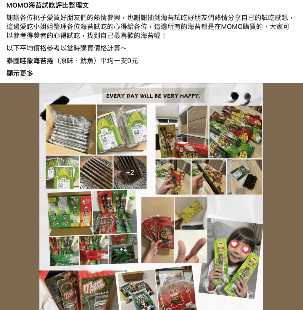 再加上,今日的社群媒體幾乎已經成為現代人社交的主要方式,有許多可以看評比或相互請益、交流的臉書社團,社友們除了分享在momo愛買愛逛的好物,點數怎麼用,共同話題聊不完,還會自動集結開箱,簡單分享多款台灣與泰國的海苔評比,讓好奇的人問得到、看得到內容物,主要是覺得多數人應該很多口味都沒吃過,而且電商平台賣食品零食都只放外包裝的照片,沒有拍內容物,社群裏可以看到真的開箱與試吃。這股風潮也讓許多消費者愈來愈擅長在網路上分享逼真感受,體貼彼此的「視吃」,讓購買決策更輕鬆。