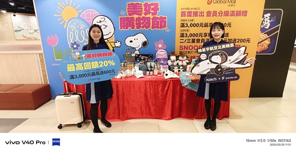 跟著史努比來場夢幻春遊!Global Mall首度與人氣明星史努比合作,於《美好購物節》檔期規劃系列活動,以「春日樂遊趣」為主題,打造充滿療癒感的拍照展區到限定會員禮,為粉絲打造歡樂、美好體驗,一起跟著史努比、查理布朗同享戶外賞花野餐、在溫暖陽光下共享下午茶,陷入可愛魅力中。