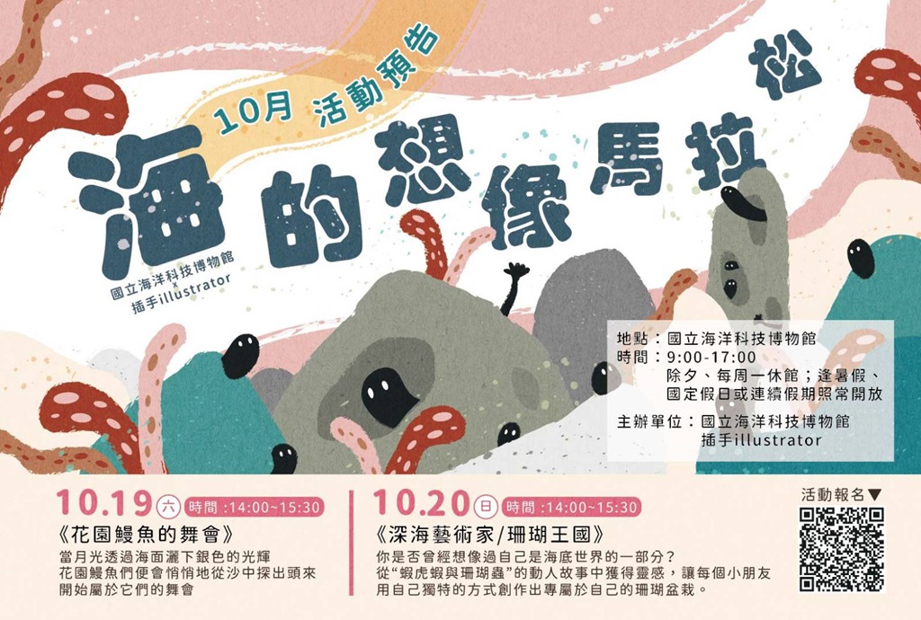 這次在海科館進行的『海的想像馬拉松』活動,係由17位插畫家共同組成『插手illustrator』團體,並以共同創作及帶領民眾共創方式,展開對海洋與環境教育的推動。10月有4場藝術共創,本週登場的共創主題為『海洋庇護所 (Marine Refuge) 』,分別有2場,明、後天各以『海底建築師/紙箱的100種想像』和『紙想陪伴你-紙箱閱讀堡壘計劃』活動,接續則有『花園鰻魚的舞會』海洋小劇場,提供給民眾與親子參與,11月還有4場,歡迎民眾免費報名參與,共同推動『落實永續、最少製造及藝術共創』理念。更多特展及活動訊息,歡迎上海科館官網查詢(https://www.nmmst.gov.tw/chhtml/newsdetail/221/8738/0)