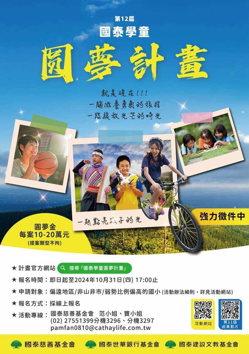 【記者 陳也賀/臺北 報導】為了支持偏遠地區的學童勇敢追夢,國泰三家基金會——國泰慈善基金會、國泰世華銀行文教基金會及國泰建設文教基金會,聯手推動『第12屆國泰學童圓夢計畫』,提供每案10至20萬元的圓夢金,幫助更多孩子實現他們的夢想。