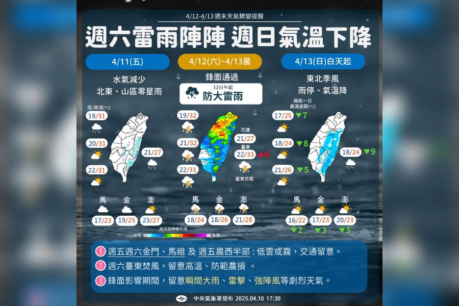 周日白天起,各地雨勢逐漸停歇,西半部及離島陽光逐漸露臉,不過,東北季風接力影響,氣溫下降,普遍比週六降5度以上,各地高溫24~26度,有轉涼、轉舒適的感覺下周。一(4/14)~周四(4/17)各地天氣多雲到晴,白天氣溫回升,但清晨有涼意、日夜溫差大。
