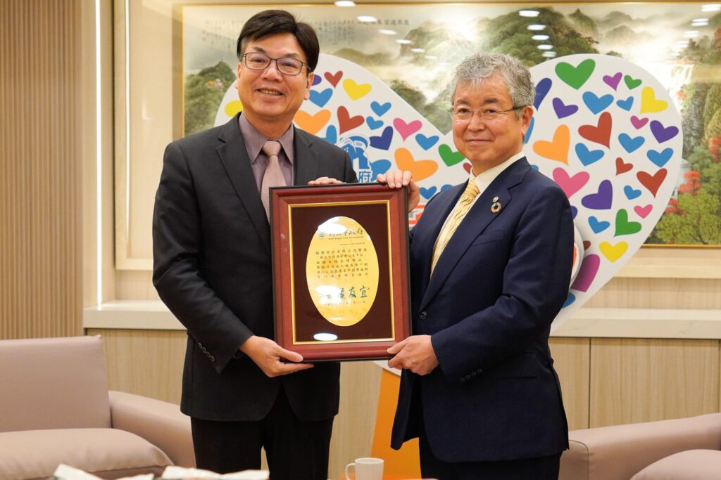 ▲劉和然代表侯友宜回贈感謝牌給嬌聯日本總公司社長高原豪久(右)。(圖/新北市社會局 提供)