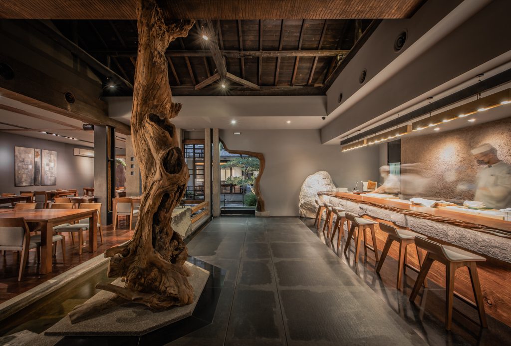 桃太郎餐廳原址為百年歷史的日據時代宿舍,經過改造後呈現典雅低調的日式庭院風格。庭院中佈滿松樹、池塘與鯉魚,潺潺流水聲營造出靜謐禪意的用餐環境。餐廳特別注重隱私與舒適感,提供多樣化的包廂選擇,無論是朋友聚會、商務宴請,還是大型活動如婚宴或展覽,都能滿足客人的需求。進店後的儀式感服務更是為整體體驗加分,從餐前熱毛巾到詳細的菜品介紹,處處體現貼心細節。