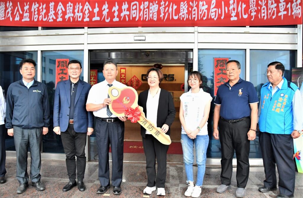 ▲由繼茂橡膠董事長粘振啓代表,以繼茂公益信託基金以及辭世的父親粘金土先生的名義,捐贈小型化學消防車一輛予彰化縣消防局,以實際行動回饋社會、造福縣民。(圖/彰縣府提供)