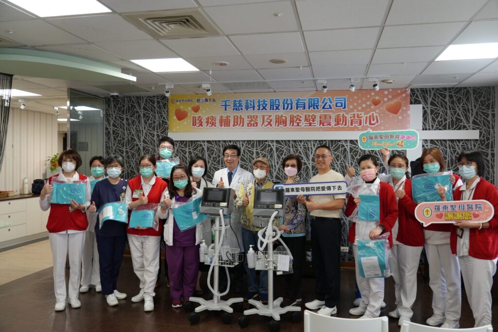千慈科技股份有限公司總裁蕭江波、董事長蕭智宏捐贈羅東聖母醫院胸腔科「咳痰輔助器」與「胸腔壁震動背心」,協助醫院胸腔科團隊提升照護品質;聖母醫院馬漢光院長表示感謝,並指出醫院將持續秉持「服務最弱小弟兄」的信念,善用資源、強化照護,為宜蘭鄉親打造更溫暖、更完善的醫療照護環境。
