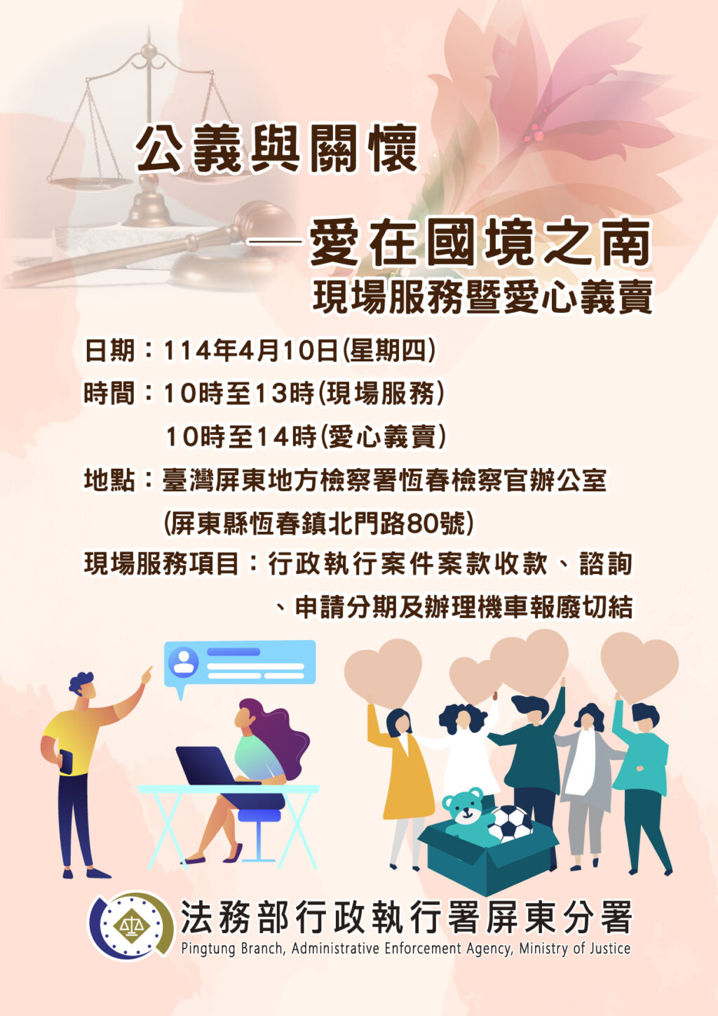 揭牌典禮當日,除有來自法務部行政執行署、臺灣高等檢察署高雄檢察分署、屏東地檢署、犯罪被害人保護協會屏東分會及各界代表蒞臨參與,共同見證行政執行服務在地深耕的成果外,是日上午10時至14時現場提供諮詢及繳款服務,並將舉辦愛心義賣活動,由屏東分署同仁捐贈愛心物資,義賣所得全數納入分署愛心基金,專款用於優先協助屏南地區之弱勢義務人,落實行政執行「公義與關懷」的核心理念,歡迎鄉親踴躍參與,共襄盛舉。