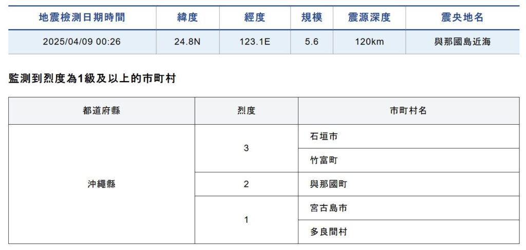 4/8日晚間23時26分,位於日本嶼那國島北北東附近海域,發生規模5.9地震,震央位於北緯 24.54度,東經 123.17度(宜蘭縣政府東方約144.2公里),震源深度15.3公里。