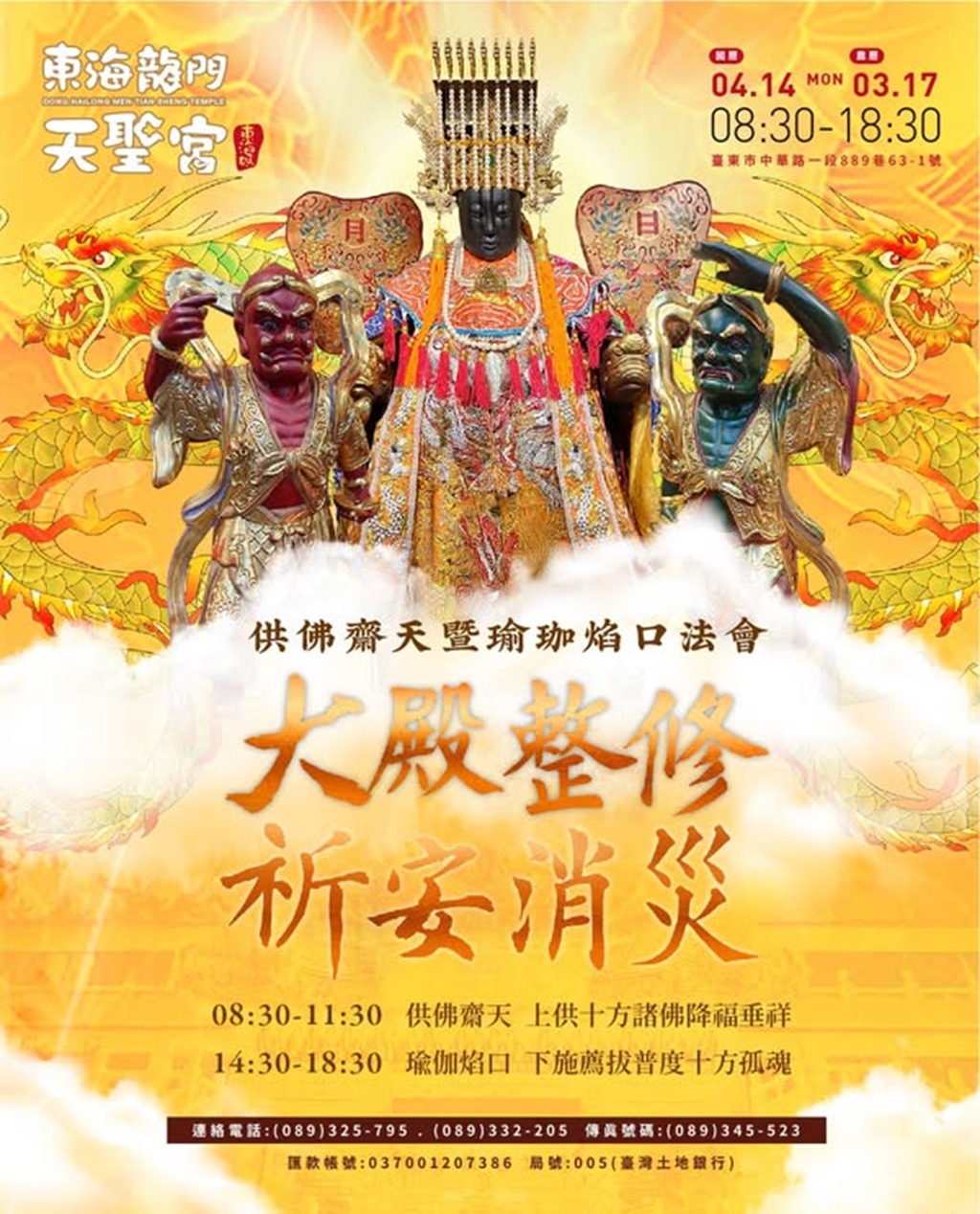 【記者陳法水/台東報導】歷經風雨洗禮的台東媽祖廟名廟東海龍門天聖宮,正如鳳凰浴火般迎來重生契機!將於2025年4月14日(一)舉辦『大殿整修祈安消災供佛齋天暨瑜伽焰口法會』,大殿整修不僅是修復樑柱瓦礫,更是修補天地人三才的靈脈通道。