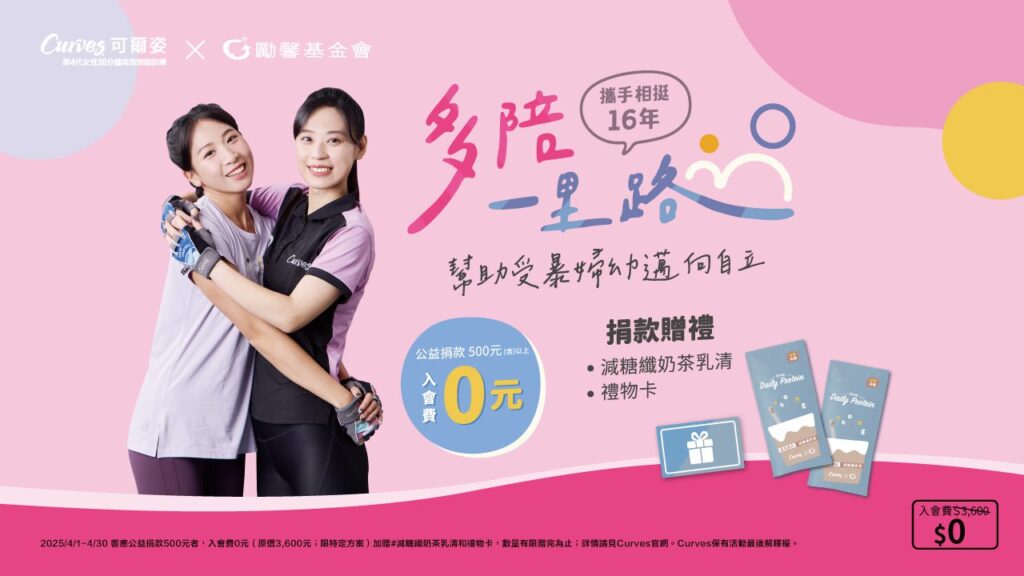 為鼓勵更多女性投入公益,即日起至2025年4月30日,Curves可爾姿推出公益優惠方案,只要來店捐款500元,不僅享有免費運動體驗與專業健康諮詢服務,更可免入會費成為Curves可爾姿會員!全數捐款將以會員名義捐贈給勵馨基金會,支持受暴婦幼自立培訓與生活重建計畫。每一次的體驗與捐款,都是幫助受暴婦幼重新站起來的力量,邀請所有女性共同參與這場溫暖的社會行動。