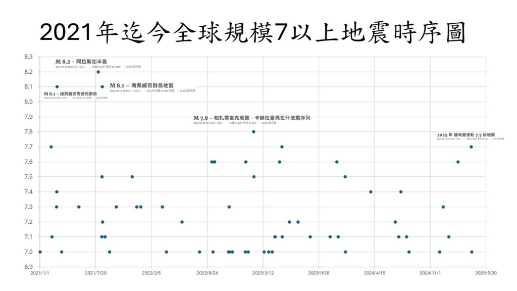 不過要注意的是,球平均約450天會有一個規模8以上的強震,但從2021年至今已經過了1332天,都沒有發生規模8以上的強震,未來需要特別注意規模8以上強震的發生。