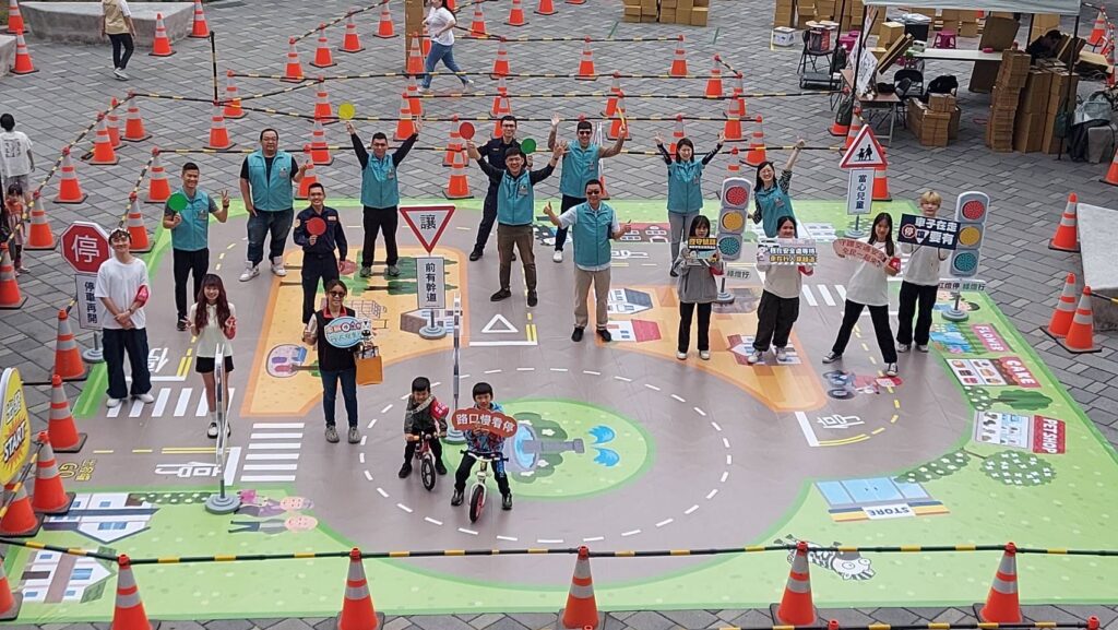 為強化兒童交通安全意識,屏東縣政府警察局特別規劃「交通城市」主題區,設置模擬道路、交通號誌、斑馬線、紅綠燈與標誌標線等設施,並以「小騎士大冒險」為體驗關卡主軸,讓孩童騎乘滑步車進行闖關,實地模擬行車環境中的各類交通情境。透過色彩鮮明的交通設計與引導,幫助孩童從遊戲中認識交通規則,加強對交通號誌與安全行為的理解與記憶。