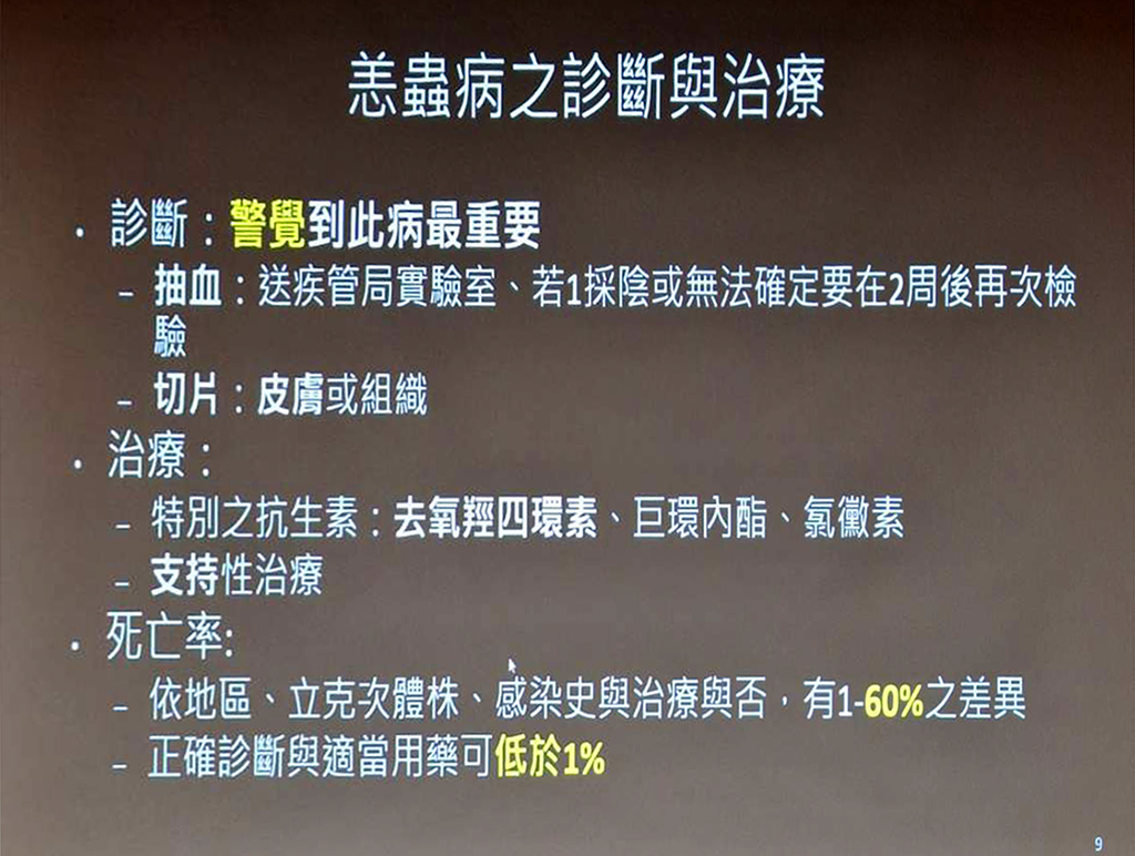 游天瑜醫師說明,「別來無恙」出自唐朝顏師古的《匡謬正俗》一書:「恙,噬人蟲也,善食人心。古者草居,多移此害,故相問勞,曰無恙。」可見古時候人們就知道這種被草叢內恙蟲叮咬有關的疾病,以此問候久別相見的朋友是否受到感染。游天瑜醫師說明,恙蟲病的病原是一種寄生於動物細胞內,稱為立克次體的細菌。人是經由帶菌的恙蟎幼蟲叮咬而感染,受感染至出現症狀約1-2週,初期類似重感冒:突發性高燒、頭痛、全身痠痛、畏寒,偶可見叮咬處出現無痛性的焦痂與淋巴結腫大,1週後可能出現紅色斑狀丘疹,但典型的皮膚表現並不一定會出現。立克次體的細胞壁結構與典型細菌不同,需使用特定幾種抗生素治療,若未及時治療,可能導致肝炎、肺炎、多重器官衰竭,甚至死亡。