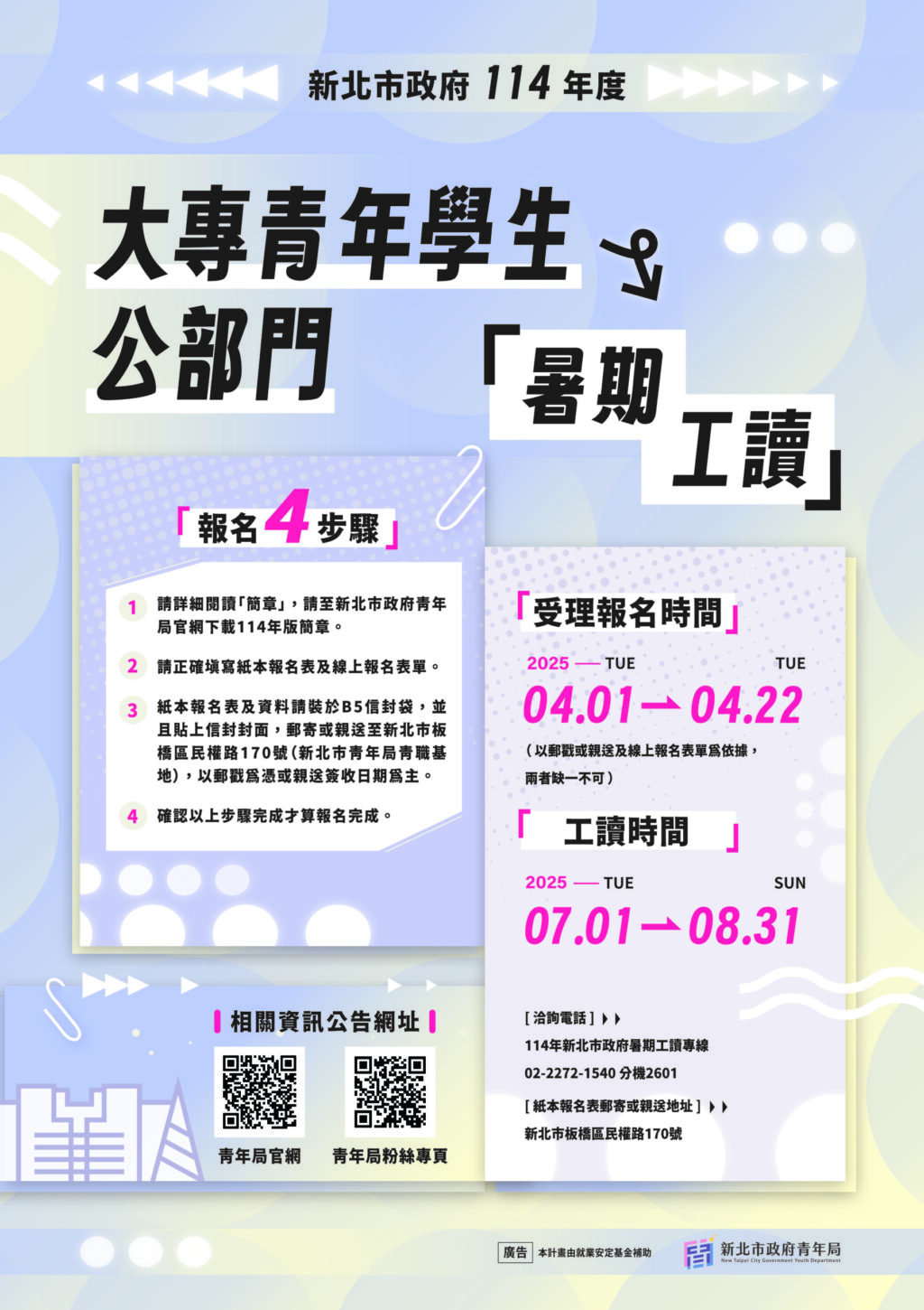 114年度「大專青年學生公部門暑期工讀計畫」開跑!為了提供新北市大學生暑假期間在公部門職場體驗的機會,新北市政府青年局彙整市府各機關職缺,提供300個暑期工讀名額,工讀期間自114年7月1日至8月31日止,每月薪資為2萬8,590元,工讀地點在新北市府各局處及所屬機關,4月22日報名截止,歡迎有興趣的大學生至青年局官網報名。