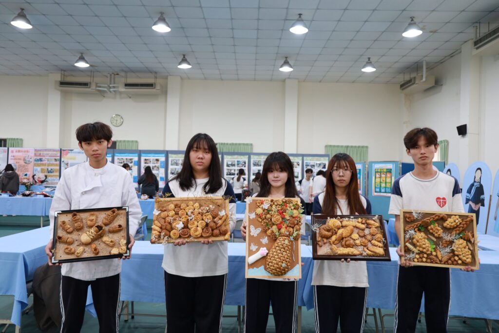 烘焙部份則是進行藝術麵包創作大賽。指導教師林佳蓁說,該創作就是用麵包來作畫,學生要先設計畫作主題,接著烘製出各種形狀的麵包模型,組合成一幅畫,最後進行固定與噴漆,作法繁複,好看不好吃,但能長久保存。該比賽透過全校師生公開票選,前五名作品得以參加成果展。