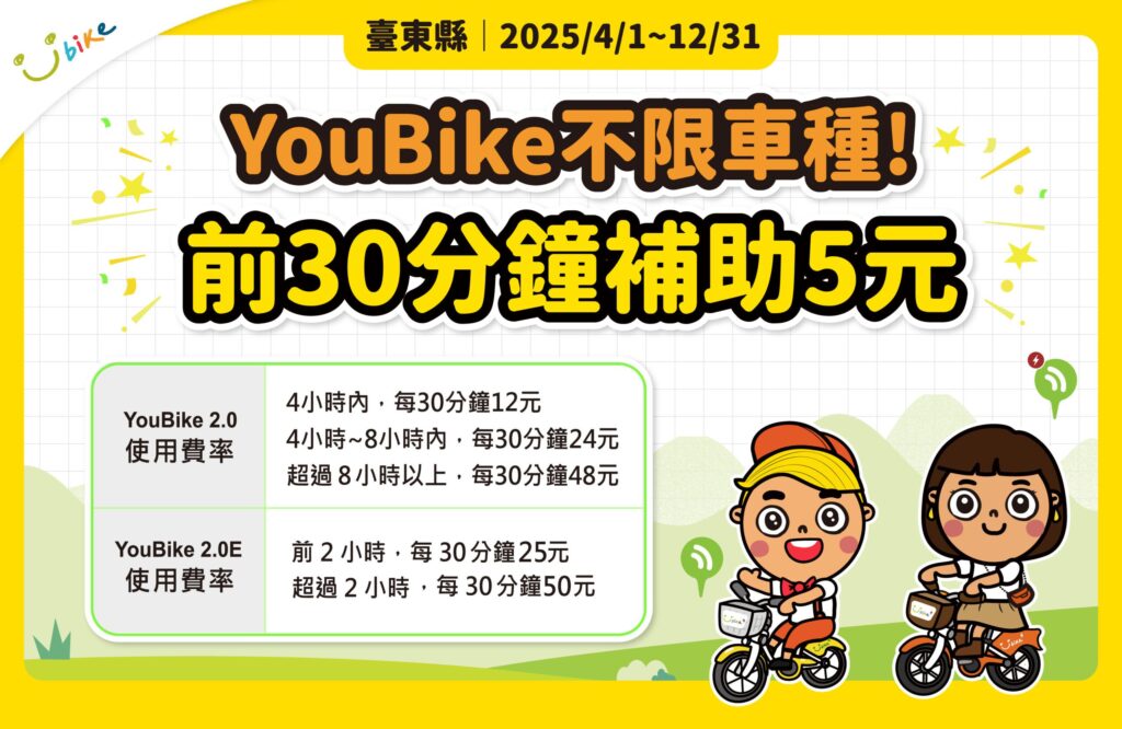 臺東縣YouBike補助,延長至今年12月31日,並同步調整補助內容,即日起,無論是YouBike 2.0或YouBike 2.0E,前30分鐘騎乘皆可享5元補助,相當於每趟直接現省5元,此外,YouBike 2.0E的費率將恢復為前兩小時內,每30分鐘25元。