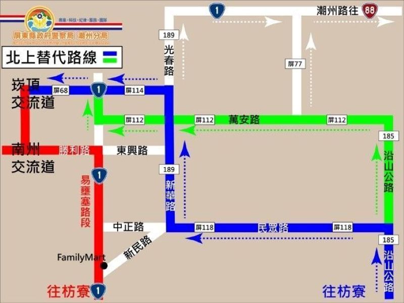 路線一:行駛北上台1線,如於新埤大橋發現車流壅塞,建議提前於台1線新民路口(全家便利商店處)轉入189線直行 → 接屏112線 → 再銜接屏68線 → 由崁頂交流道上國道3號北上,或選擇接潮州台88線快速道路北上。