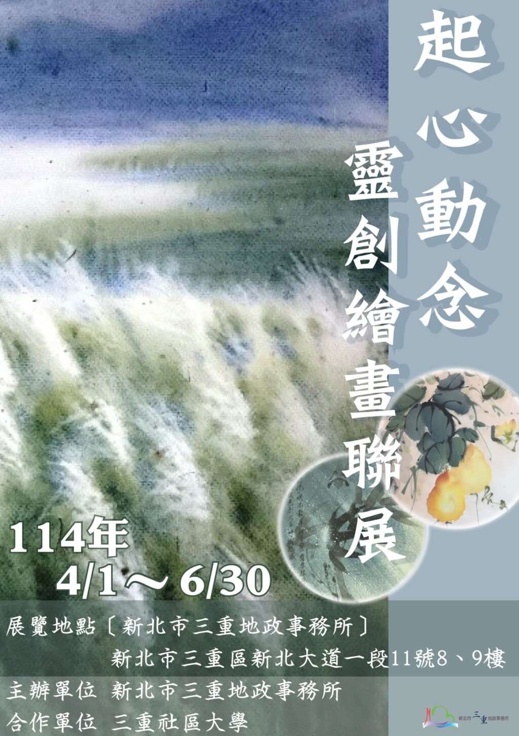 新北市三重地政事務所為營造優質洽公環境、提供藝文交流場域,邀請三重社區大學合作舉辦「起心動念 靈創繪畫聯展」,展期自114年4月1日起至6月30日止,歡迎市民蒞臨參觀。