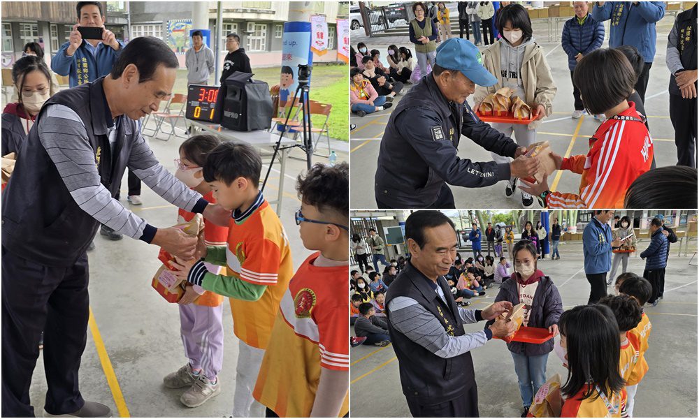 ▲鄉長沈清山(左及右下)與鄉代會副主席吳旺水(右上)到壯圍國小發放兒童節禮物。(圖∕陳木隆攝)