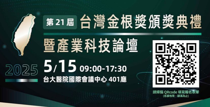 「第21屆台灣金根獎頒獎典禮暨產業科技論壇」活動日期及時間:2025年5月15日,時間09:00至17:30,地點:台大醫院國際會議中心401廳(地址:台北市中正區徐州路2號)