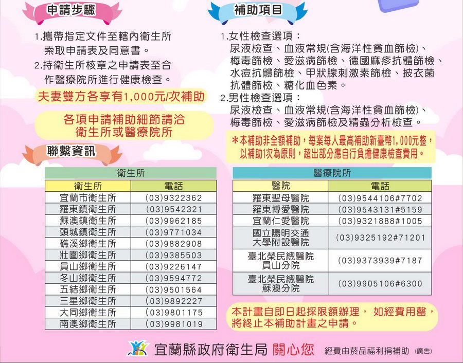 補助對象及條件為:1.夫妻其中一方設籍宜蘭縣;2.雙方為合法婚姻關係,且未生育第一胎。符合資格者,每人可享有1次結婚後懷孕前健康檢查補助(1,000元/次),申請人需攜帶夫妻雙方戶籍謄本或戶口名簿正本、身分證及健保卡至轄內12鄉鎮市衛生所申請;審查符合資格者,再持衛生所核章的申請表正本至合約醫療院所進行相關健康檢查項目。