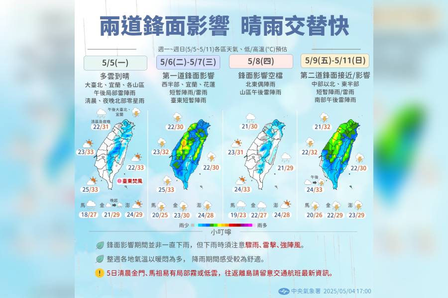氣象署進一步說明,周二、周三(5/6-7)將迎來第一道鋒面,西半部、宜蘭、花蓮、離島都有局部短暫陣雨或雷雨的機率,臺東亦有局部短暫陣雨。周四(5/8)將是鋒面影響的短暫空檔,降雨範圍縮小到北部、東半部及金門、馬祖有局部短暫陣雨,中南部及澎湖回到多雲到晴的天氣,午後各山區仍有局部短暫雷陣雨可能。