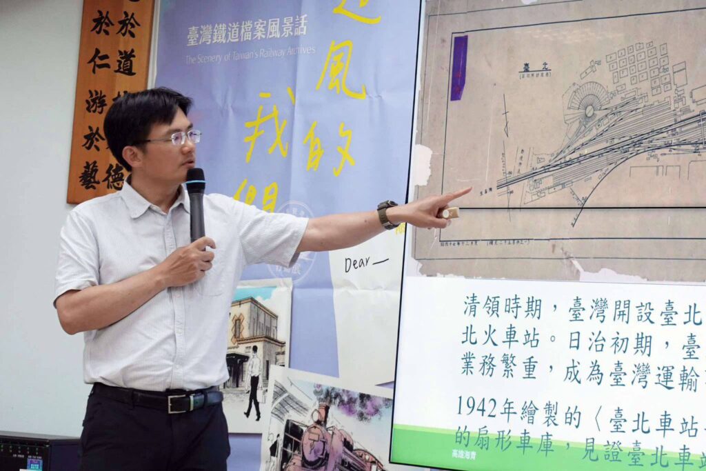 ▲許研究員講解檔案中的臺北車站。(圖/高雄海青工商)